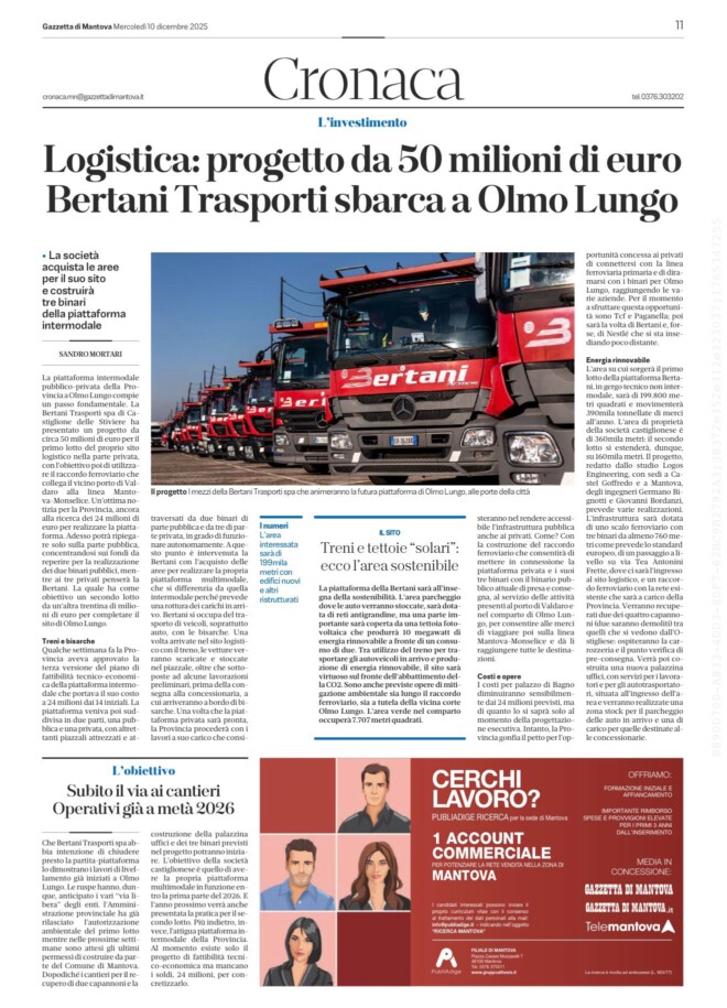 Bertani Trasporti: a Mantova – Olmolungo un sito logistico e piattaforma ferroviaria